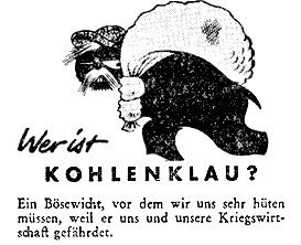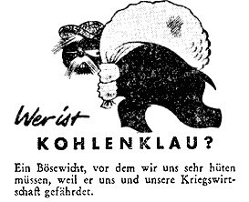 Der Kohlenklau ist ein böser Mann, der dem deutschen Volke schaden will. Darum müssen wir aufpassen, daß er nicht in unser Haus kommt, denn er verschafft sich überall Zutritt und stiehlt Wärm, Kohle, Strom und Gas.