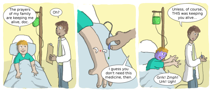 Ich mache mich übrigens bisweilen über Leute lustig, die an Homöopathie glauben. Es geht mir dabei nicht darum, jemanden zu verletzen. Selbst die Tatsache, dass der Placebo-Effekt ja helfen kann ist mir bekannt und ich bin bisweilen fast versucht, die Homöopathie deshalb ein wenig zu „respektieren“. Diese irrationale Einstellung kann aber zum Tod führen, wenn man dann eben nicht an einer Cheomo teilnimmt, weil das der Guru nicht so gerne hat. Wer daran Glauben will, glaube daran. Wer aber in der Schweiz lebt, der muss damit leben können, dass man ihn dafür auslacht und auslachen darf.