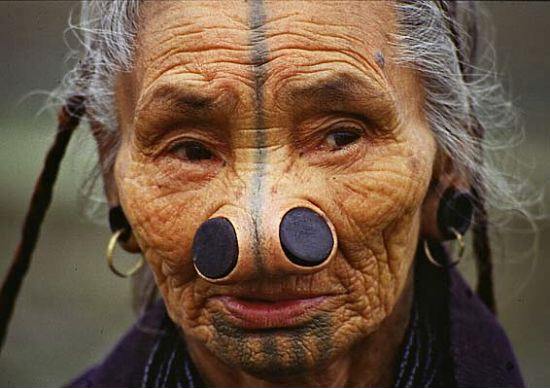 Nur weil es so schön ist: Die Lippen- und Ohren-Zerschlitzte Kultur (Bild) kenne ich nicht. Also ein anderes Beispiel: Bei den Apa-Tani werden die Frauen mit Nasenscheiben absichtlich für Aussenstehende verunstaltet (Bild: Apa-Tani Frau), um dem Frauenraub Einhalt zu gebieten - für die Apa-Tani hat es sich natürlich zum Schönheitsideal gewandelt.