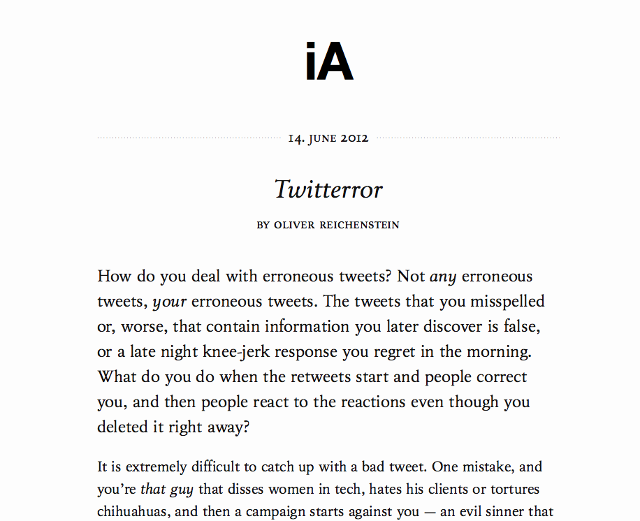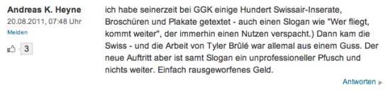 Apple-Laien begegnen mir immer wieder mit dem Argument: »Mein krasses Windows Y-Tablet-irgendwas hat imfall 300 Speicher und 700 Geschwindigkeit und erst noch eine 15 Megairgendwas-Kamera, während dein Apple - wie viel hat das überhaupt ? Und gekostet hat es auch viel weniger.« Antwort: I couldn’t care less. Mein Apple-Dings kostet vielleicht viel, aber es poppen nicht alle zehn Sekunden Fehlermeldungen auf, ich muss keine Software installieren, wenn ich einen Memory-Stick anschliesse und es tut generell das, was ich von ihm erwarte. Daher ist es so viel wert, wie es kostet.